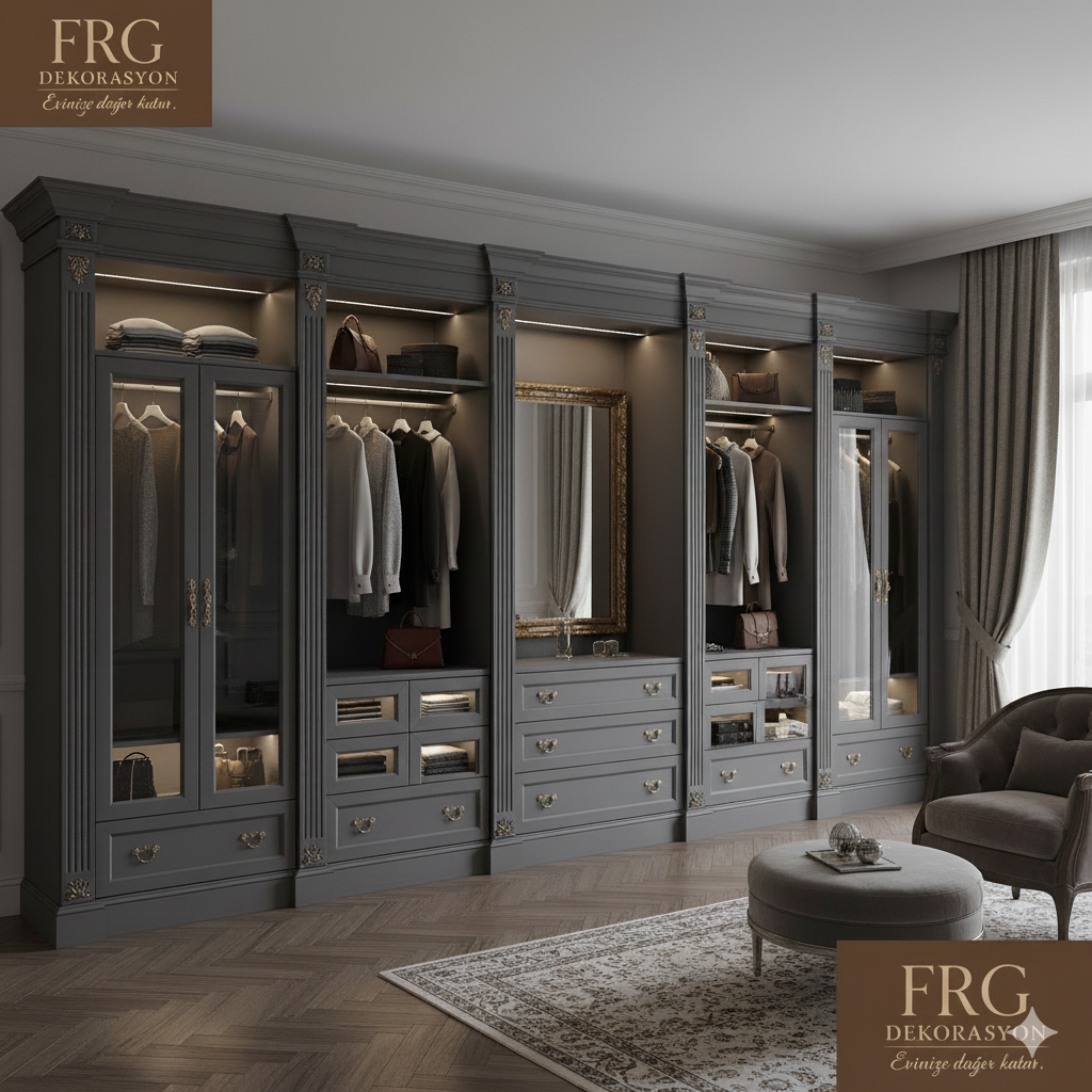 Giyinme dolapları, sadece kıyafetlerimizi düzenlediğimiz alanlar olmaktan çok daha fazlasıdır; yatak odanızın veya özel giyinme alanınızın atmosferini belirleyen önemli bir tasarım öğesidir. Giyinme dolabı seçerken tarzınız, ihtiyaçlarınız ve odanızın genel dekorasyonu büyük önem taşır. Peki, siz klasik zarafetten mi yanasınız, yoksa modern minimalizmden mi? FRG Dekorasyon olarak, her iki tarzda da size özel çözümler sunuyoruz.